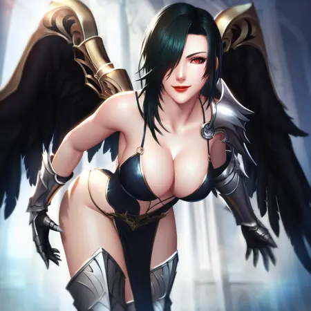 1Phase Brigit: 1Phase_Brigit, 1girl, 가슴, 큰 가슴, 검은 머리, 단독, 붉은 눈, 한쪽 눈에 머리카락 덮임, 붉은 입술, 붉은 눈, 검은 날개, 날개, 깃털 날개, 장갑, 갑옷 부츠, 검은 갑옷, 검은 장갑, 골반 커튼, 젖가슴, 정강이 보호대, 검은 드레스