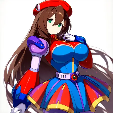 1girl,brown hair,green eyes, long hair, dress, blue dress, red dress, android, hair between eyes, gloves,beret,skirt