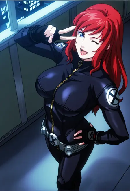 Trigger = bwpm, Tags = 1girl, solo, red hair, long hair, lipstick, blue eyes, black bodysuit, zipper, belt, fingerless gloves