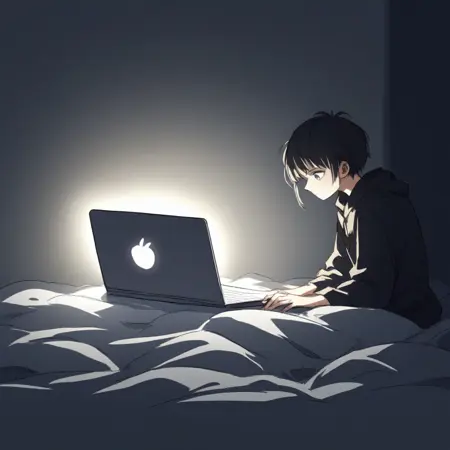 Optional: laptop, sitting, dark,indoors, shadows, harsh lighting