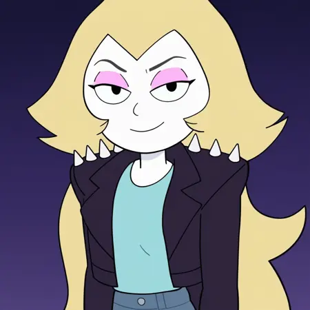 服装: 带肩部尖刺的黑色皮革夹克,浅蓝色T恤,灰蓝色紧身牛仔裤,白色高筒靴