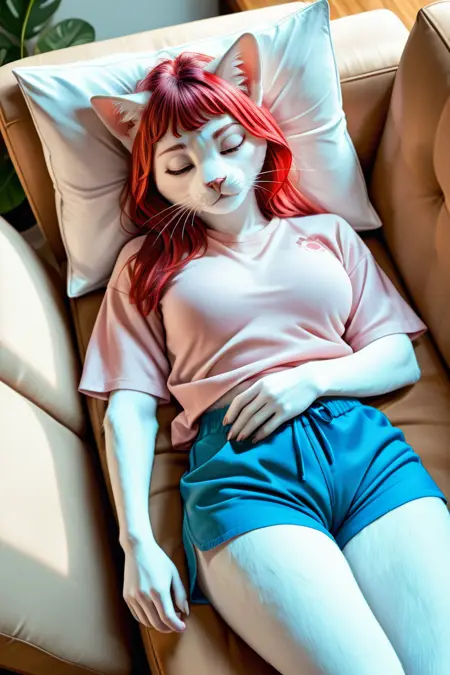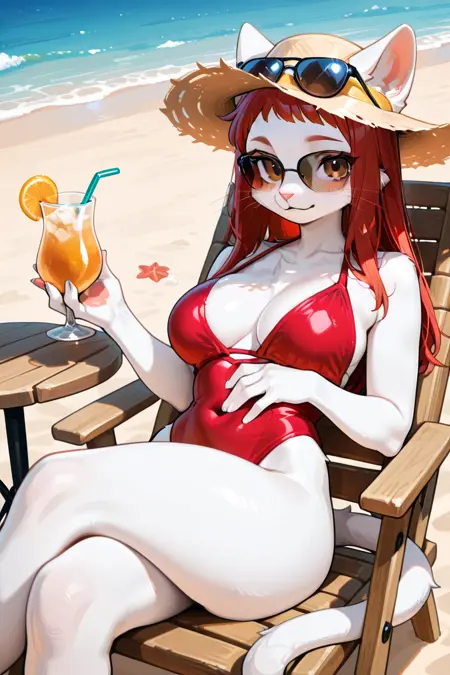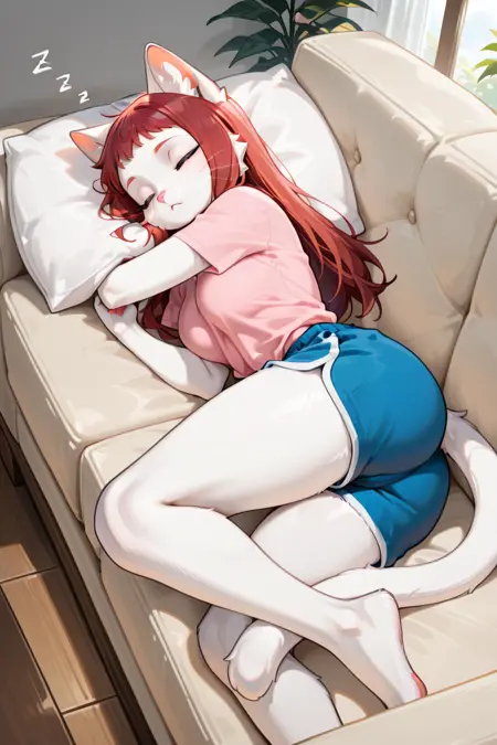 태그: bella, anthro, 페르리 여성, 집고양이, 흰색 털, 흰색 몸체, 분홍색 코, 고양이 꼬리, 빨간 머리카락, 곧은 머리카락, 긴 머리카락, 짧은 앞머리, 갈색 눈,