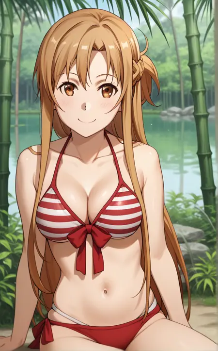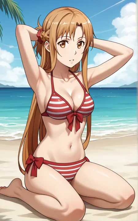 RedBikini_Asuna_ownwaifu, 1girl, asuna (sao), brown eyes, brown hair, medium breasts, swimsuit, cleavage, striped bikini, braid, collarbone, long hair, front-tie top, hair over shoulder, bare shoulders, long legs, red bikini, red bow, thigh gap, blonde hair, bow, french braid, scrunchie,