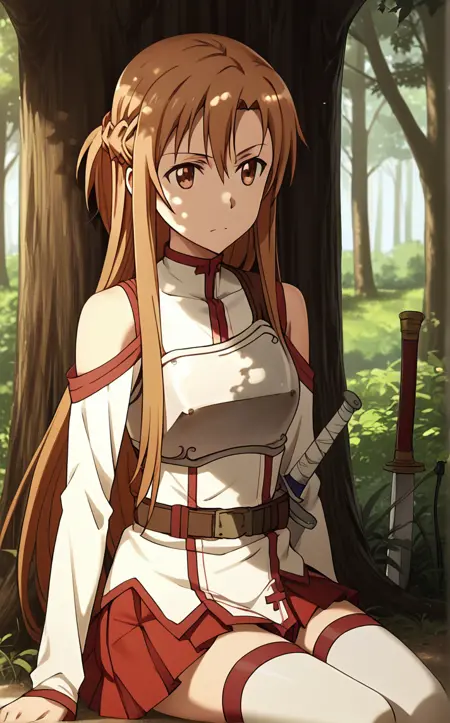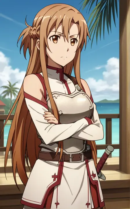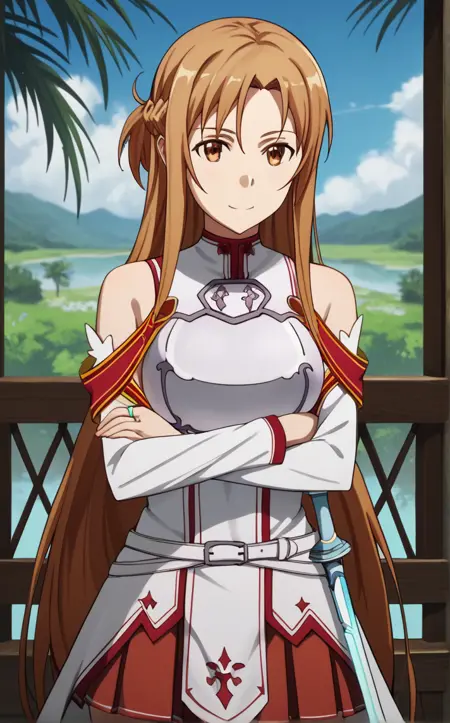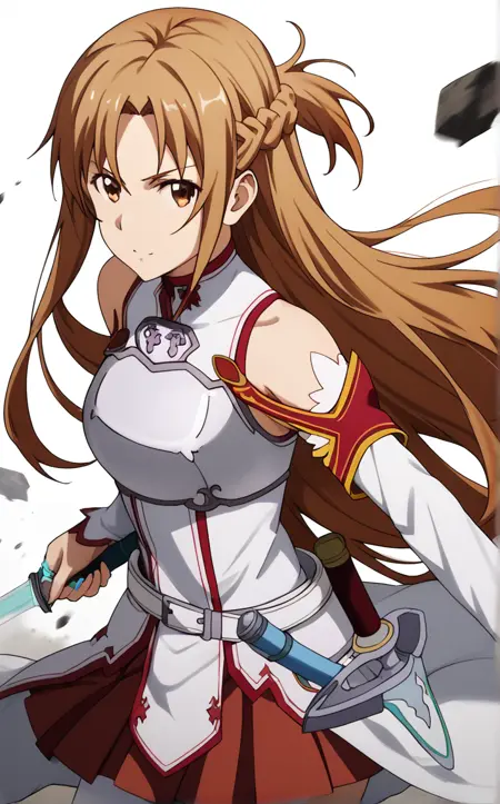 BreastPlate_Asuna_ownwaifu, 1girl, asuna (sao), brown hair, brown eyes, bare shoulders, long hair, breastplate, armor, detached sleeves, french braid, long sleeves, belt, sheath, rapier, white thighhighs, pleated skirt, hair between eyes, red skirt, white armor, sheathed, sleeveless, white dress, half updo, zettai ryouiki, bangs, collarbone, miniskirt, white sleeves, cross,