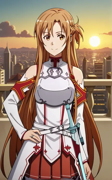 MainOutfit_Asuna_ownwaifu, 1girl, asuna (sao), brown eyes, brown hair, bare shoulders, breastplate, long hair, detached sleeves, armor, white armor, braid, pleated skirt, sheath, red skirt, white thighhighs, french braid, rapier, white sleeves, hair between eyes, sheathed, long legs, jewelry, long sleeves, bangs, half updo, zettai ryouiki, miniskirt, ring, shiny hair, white belt, cape, choker, breasts, parted bangs, waist cape, wedding ring, white cape,