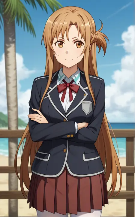 SchoolUniform_Asuna_ownwaifu, 1girl, asuna (sao), brown eyes, brown hair, blazer, school uniform, neck ribbon, red ribbon, long hair, black jacket, braid, french braid, white shirt, collared shirt, long sleeves, school emblem, sobu high school uniform, half updo, white pantyhose, black skirt, grey pantyhose, long legs, pleated skirt, sidelocks,