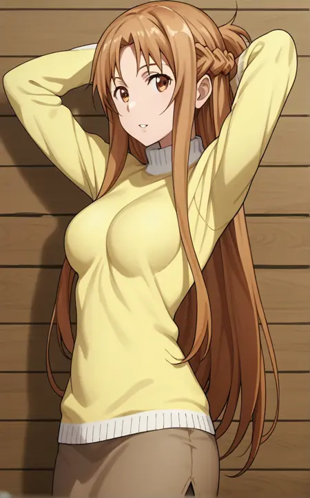 YellowSweater_Asuna_ownwaifu, 1girl, asuna (sao), brown eyes, brown hair, sweater, long hair, braid, turtleneck, french braid, long sleeves, half updo, bangs, yellow sweater, turtleneck sweater, casual, brown skirt, shiny hair, medium breasts, parted bangs, ring, breasts, pantyhose, hair between eyes, long skirt, pencil skirt, sidelocks, unsheathed, wooden wall