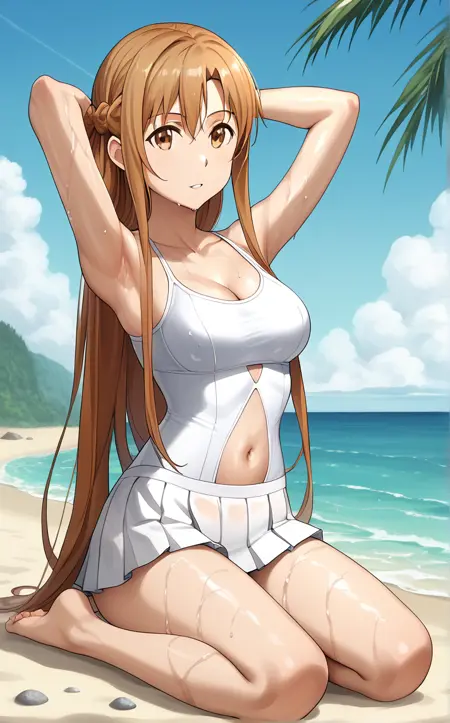 SwimSuit_Asuna_ownwaifu, 1girl, asuna (sao), brown eyes, brown hair, bare shoulders, collarbone, french braid, long hair, cleavage, medium breasts, sleeveless, bangs, navel, braid, hair between eyes, midriff, stomach, wet hair, breasts, white one-piece swimsuit, miniskirt, white skirt, bare legs, casual one-piece swimsuit, clothing cutout, long legs, navel cutout, pleated skirt,
