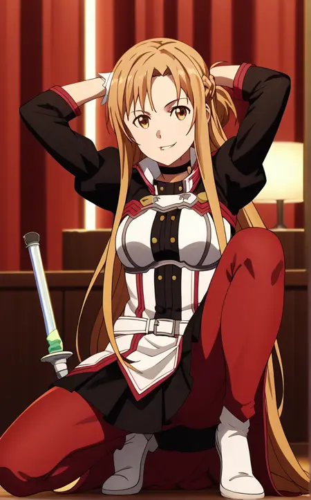 BlackDress_Asuna_ownwaifu, 1girl, asuna (sao), brown eyes, brown hair, french braid, long sleeves, white gloves, long hair, choker, bangs, braid, jacket, sheath, rapier, dress, medium breasts, parted bangs, sidelocks, breasts, jewelry, sheathed, armor, shiny hair, uniform, black choker, blonde hair, half updo, red pants, belt, white armor, skirt, white jacket, black shirt, puffy sleeves, short dress,