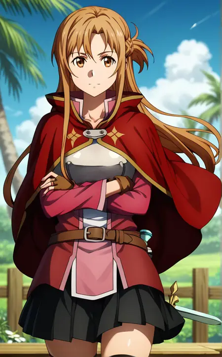 RedCapelet_Asuna_ownwaifu, 1girl, asuna (sao), brown eyes, brown hair, long hair, french braid, cape, armor, breastplate, red cape, cloak, hair between eyes, fingerless gloves, braid, brown gloves, bangs, red cloak, rapier, long sleeves, jewelry, pleated skirt, belt, black skirt, sidelocks, miniskirt, black thighhighs, half updo, zettai ryouiki, sheath, sheathed, shiny hair, collarbone, red jacket, capelet, red capelet, parted bangs, ring, breasts, brown belt, medium breasts,