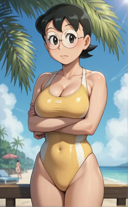 YellowSwimsuit_TamakoNobi_ownwaifu, 1girl, black eyes, black hair, breasts, cleavage, glasses, mature female, short hair, casual one-piece swimsuit, medium breasts, yellow one-piece swimsuit, large breasts, round eyewear,