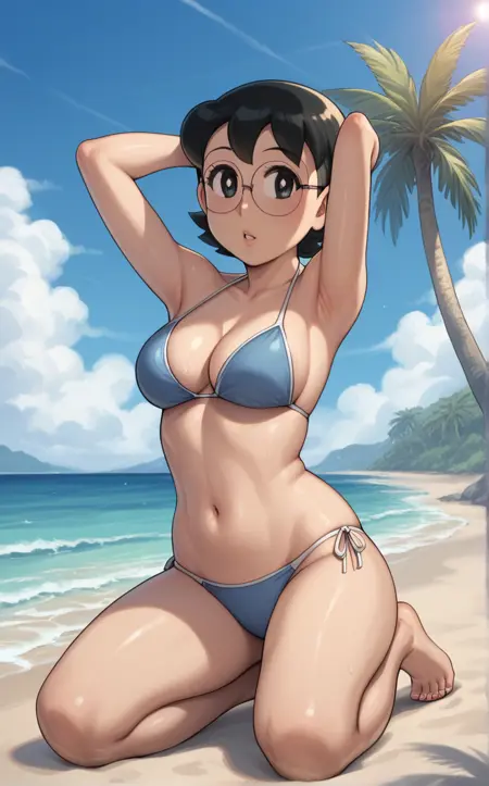 BlueBikini_TamakoNobi_ownwaifu, 1girl, black eyes, black hair, blue bikini, breasts, cleavage, glasses, medium breasts, short hair, swimsuit, mature female, navel, bare shoulders, bright pupils, white pupils,