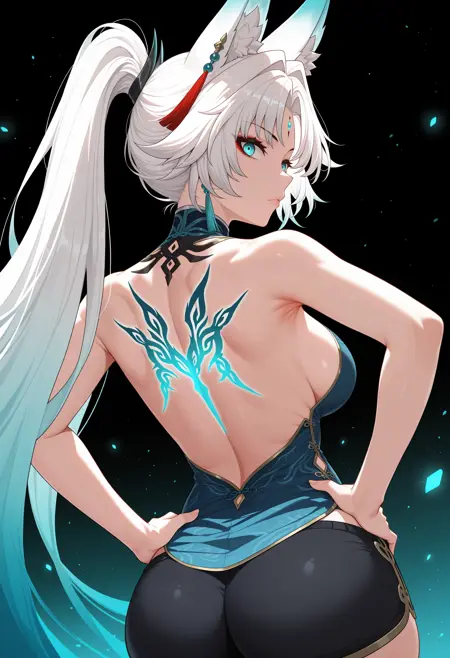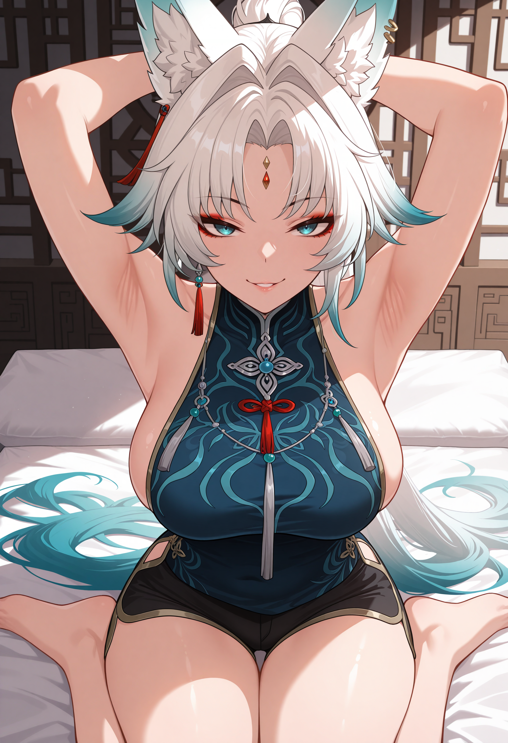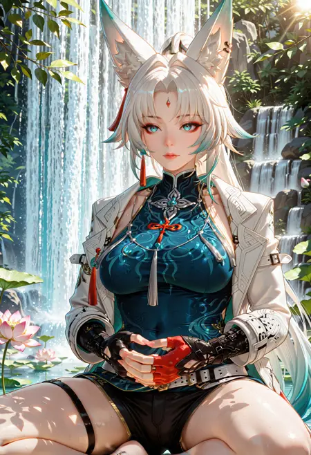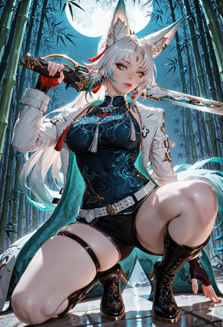 feixiaohsr, 蓝色眼睛, 白发, 渐变发色, 蓝发, 发丝飘动, 分开的刘海, 马尾, 长发, 红色眼影, 彩妆, 额饰, 面部纹饰, 动物耳朵, 动物耳绒毛, 流苏耳环, 饰品, 中国传统服饰, 白色外套, 开襟外套, 长袖, 黑色手套, 红色手套, 无指手套, 蓝色连衣裙, 短裤, 黑色短裤, 腰带, 白色腰带, 大腿绑带, 高跟靴, 过膝靴, 黑色鞋履,