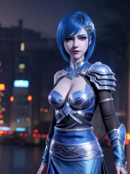 - 1girl,mature female, cityscape, night,looking at viewer, hair ornament, short hair, makeup, armor,black shoulder armor,scale armor, cowboy shot, blue hair,dress,facial mark, jewelry,