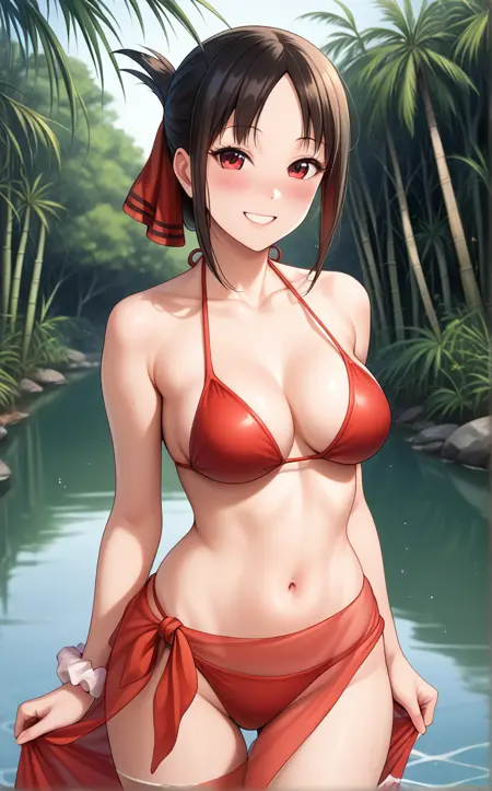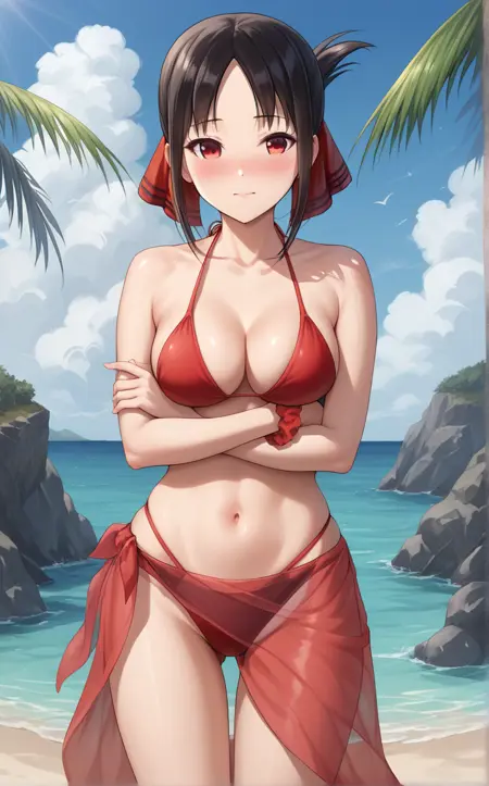 RedBikini_Kaguya_ownwaifu, 1girl, shinomiya kaguya, swimsuit, hair ribbon, parted bangs, red eyes, red ribbon, black hair, red bikini, bare shoulders, folded ponytail, sidelocks, collarbone, short hair, navel, halterneck, side-tie bikini bottom, cleavage, medium breasts, sarong, see-through, thighs, string bikini, groin, nose blush, wrist scrunchie, thigh gap, shiny hair, bangs, eye reflection, forehead,