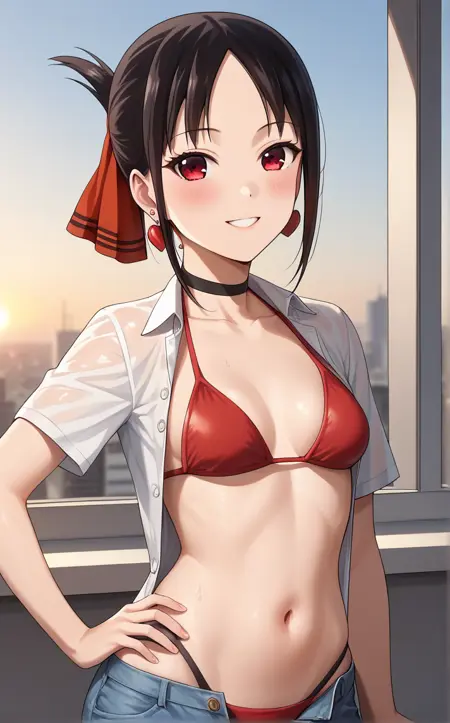 FrilledBikini_Kaguya_ownwaifu, 1girl, black choker, black hair, collarbone, earrings, folded ponytail, frills, hair ribbon, jewelry, parted bangs, red eyes, red ribbon, shinomiya kaguya, short hair, short sleeves, sidelocks, swimsuit, white shirt, bikini under clothes, frilled bikini, highleg bikini, navel, open clothes, open shirt, red bikini, shorts, skindentation, small breasts, stomach, breasts, denim, midriff, open fly,