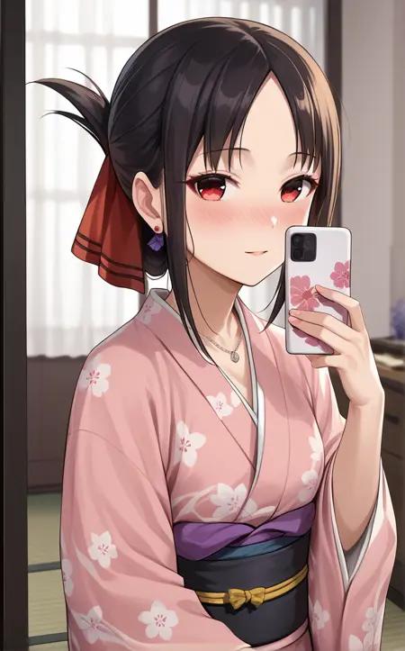 Kimino_Kaguya_ownwaifu, 1girl, shinomiya kaguya, black hair, japanese clothes, red eyes, hair ribbon, sidelocks, red ribbon, parted bangs, folded ponytail, short hair, floral print, print kimono, long sleeves, pink kimono, obi, sash, wide sleeves, collarbone, hair ornament, hair flower, black kimono, red bow, shiny hair, nose blush, purple flower, butterfly print, hair bow, forehead, jewelry, bangs, empty eyes, kimono, necklace, earrings, eye reflection,
