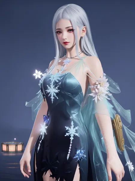 - 1girl, dress,jewelry, necklace, snowflakes, bare shoulders, cityscape, night, looking at viewer, mature female, flower,multicolored clothes, cowboy shot, trim,crystal, gradient, cowboy shot,