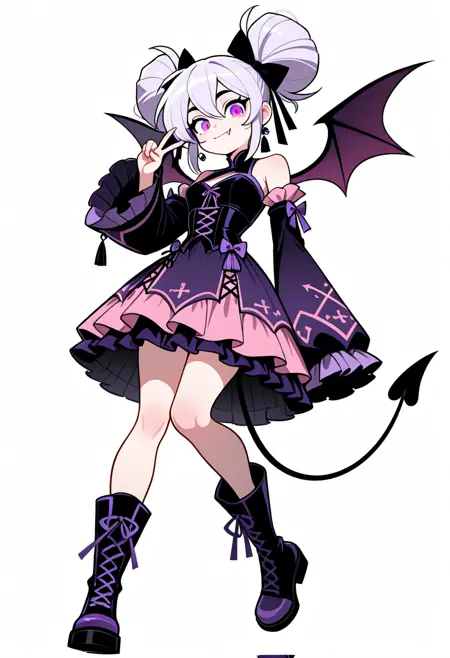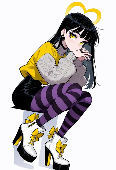 로키 - 1girl, solo, 노란 눈, 긴 머리, 앞머리, 검은 머리, 검은 손톱, 노란 리본, 보석, 귀걸이, 스웨터, 긴 소매, 치마, 검은 치마, 팬티스타킹, 줄무늬 팬티스타킹, 보라색 팬티스타킹, 하이힐, 하이힐 부츠, 플랫폼 신발, 부츠, 흰색 신발,