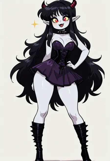 Demon Girl - 1girl, solo, long hair, black hair, purple and black hair, looking at viewer, horns, pointy ears, bangs, blunt bangs, slit pupils, yellow sclera, grey skin, makeup, eyeshadow, black lips, purple dress, black boots, knee boots, spikes, spiked collar, gothic,