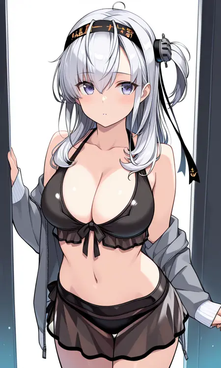 Default Outfit : suzutsukiKC,grey eyes, long hair, school uniform, white hair, pleated skirt,white necktie, elbow gloves, white gloves, miniskirt, one side up, white skirt,clothes writing, white pantyhose, black sailor collar, hachimaki, white bodysuit,grey jacket,jacket on shoulders,corset, short sleeves,black headband,