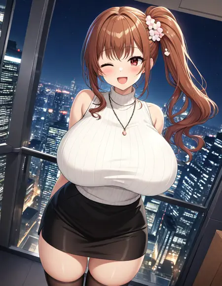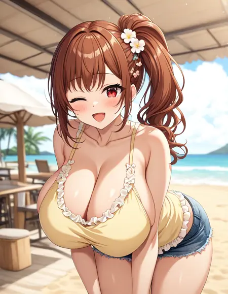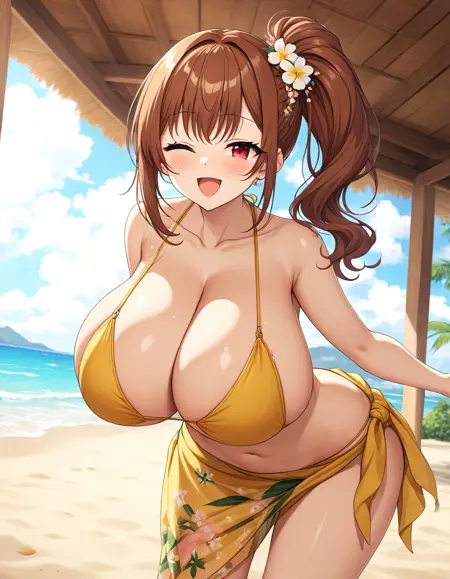base:large hanging breasts, red eyes, slant eyes, one eye closed, ;D, brown hair, side ponytail, long hair, hair ornament, shiny hair, shiny skin,