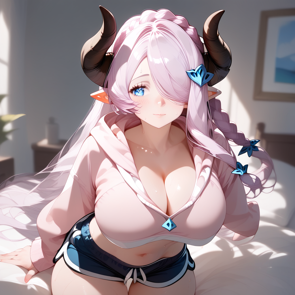 1소녀, Narmaya, 뿔, 뾰족한 귀, 라벤더색 머리, 땋은 머리, 매우 긴 머리, 한쪽 눈을 가린 머리, 머리 장신구, 머리 장신구가 있는 collarbone, 가슴, 돌핀 반바지, 끈, 허벅지, 배꼽, 큰 가슴, 가슴