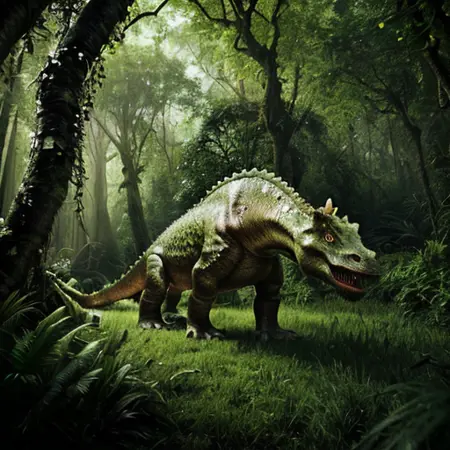 Trained only with photoreal animal photos, and 3d reference images of dinosaurs.