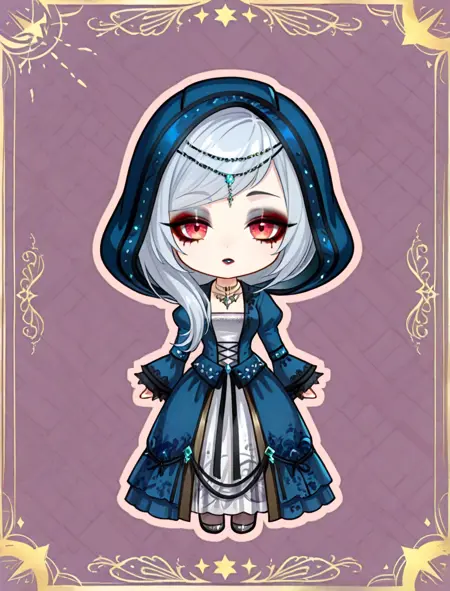 makeup, blue jacket, white dress, hair ornament, necklace