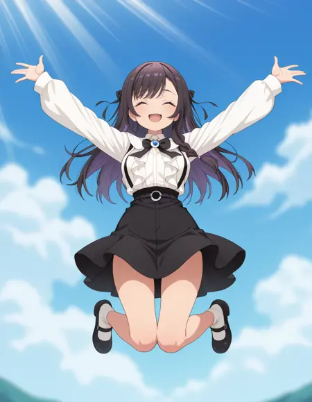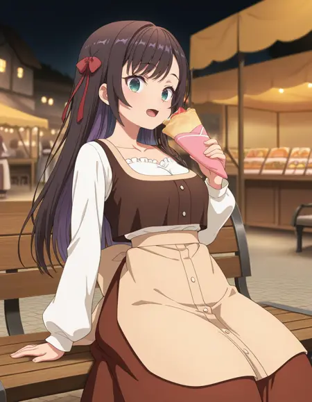 <lora:alina_clover-girumasu_s1-v4-ixl-anime-soralz:1>, alina clover (girumasu), long hair, multicolored hair, black hair, purple hair, swept bangs, red hair ribbon, single braid, blue eyes, (green eyes:0.8), date outfit, white blouse, brown vest, long sleeves, beige apron, back bow, beige bow, brown skirt, white socks, mary janes