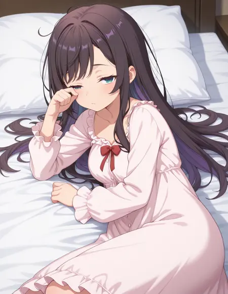 <lora:alina_clover-girumasu_s1-v4-ixl-anime-soralz:1>, alina clover (girumasu), long hair, multicolored hair, black hair, purple hair, swept bangs, blue eyes, (green eyes:0.8), nightgown, collarbone, frills, red bow, long sleeves, puffy sleeves