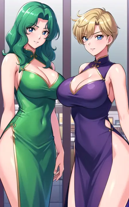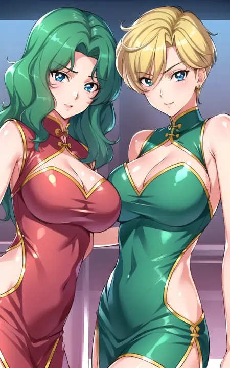 With both: 2girls, lora:HaruMichiV3:0.7, tenouharuka, KaiouMichiru, tenouharukaandkaioumichiru,