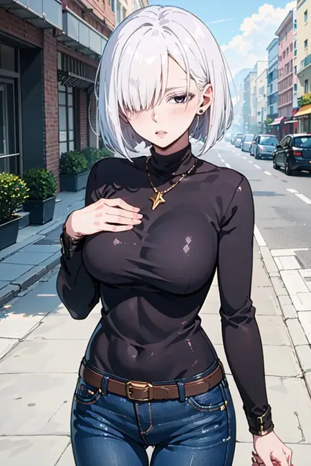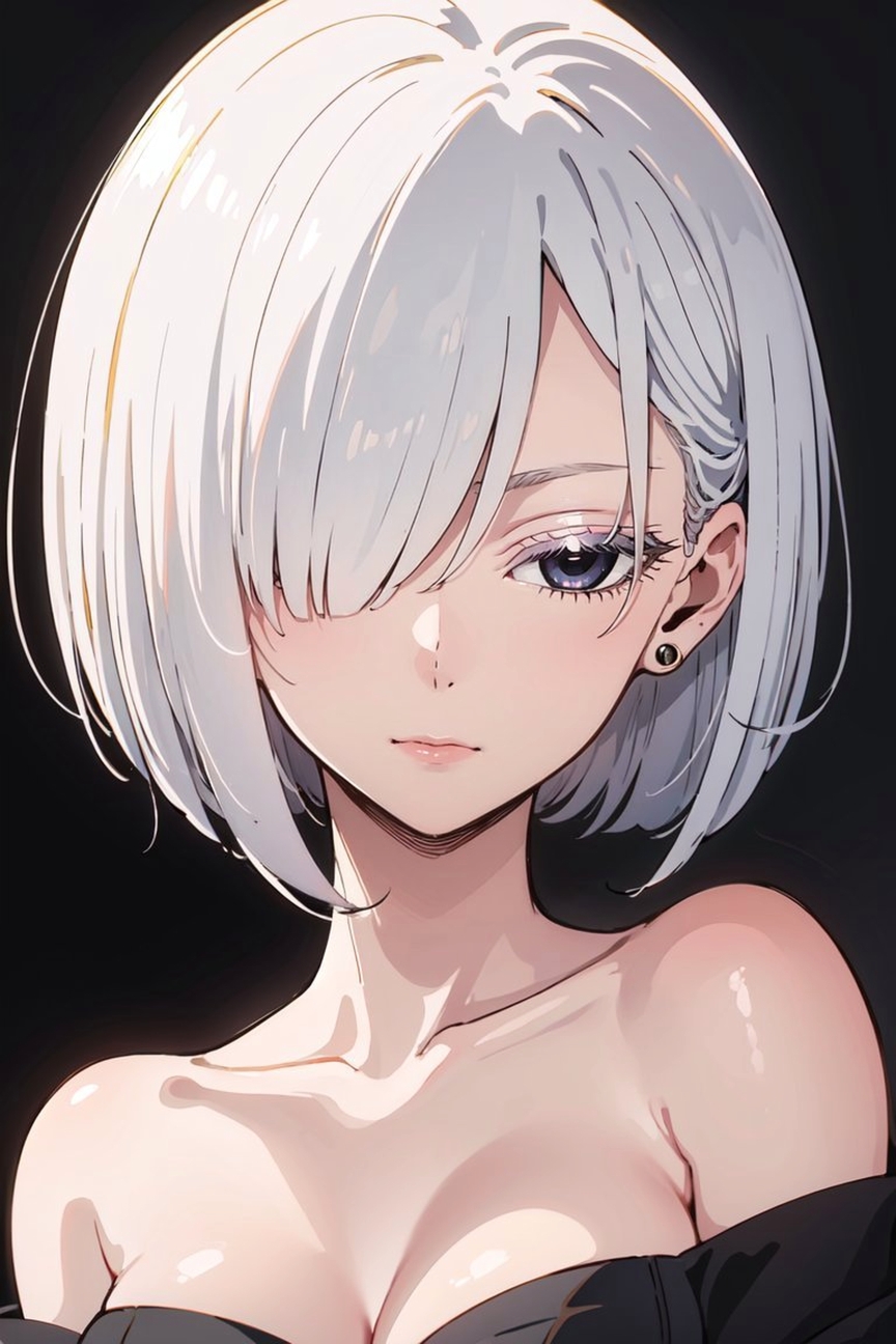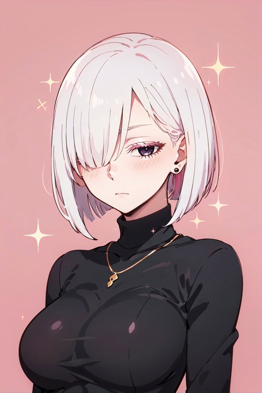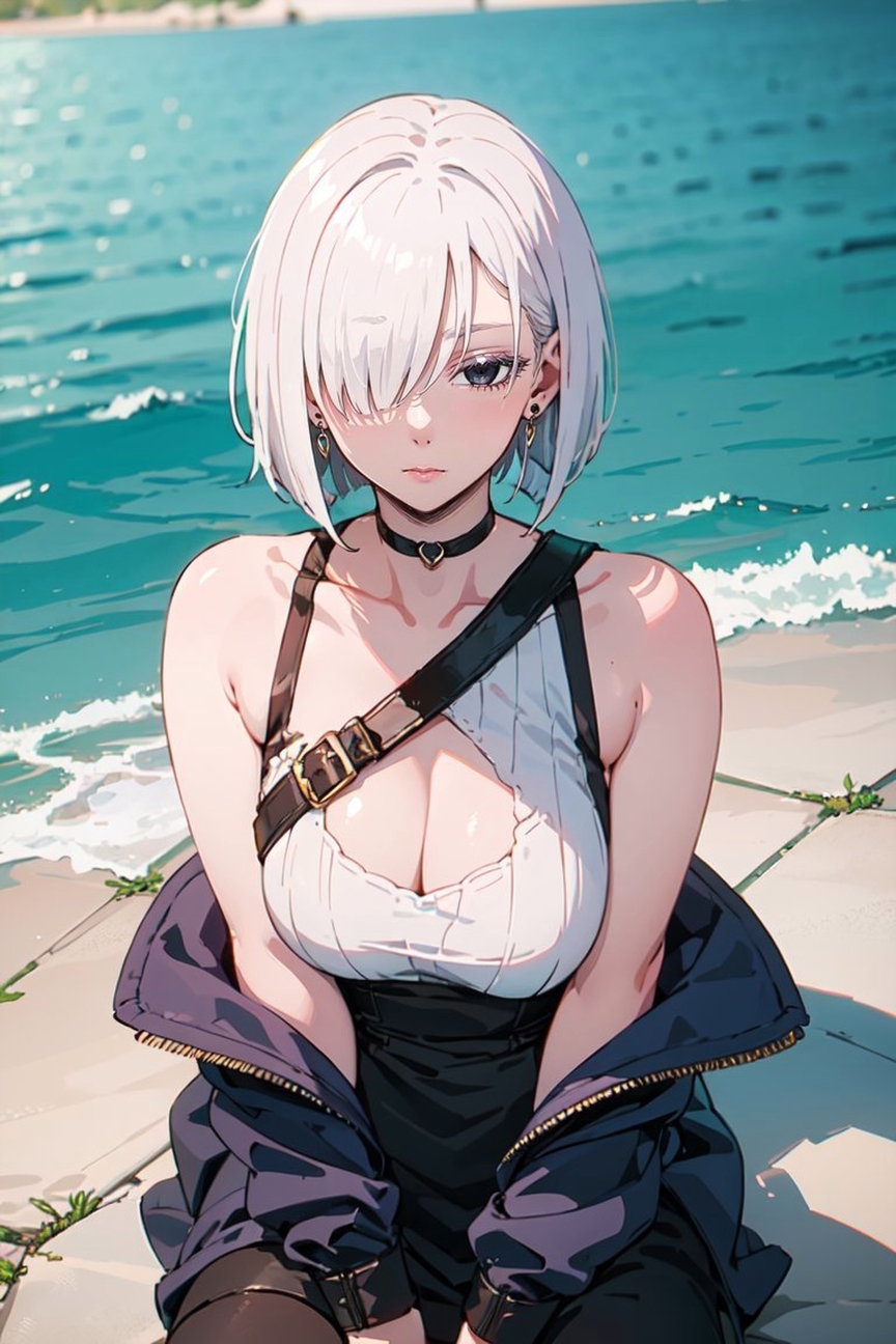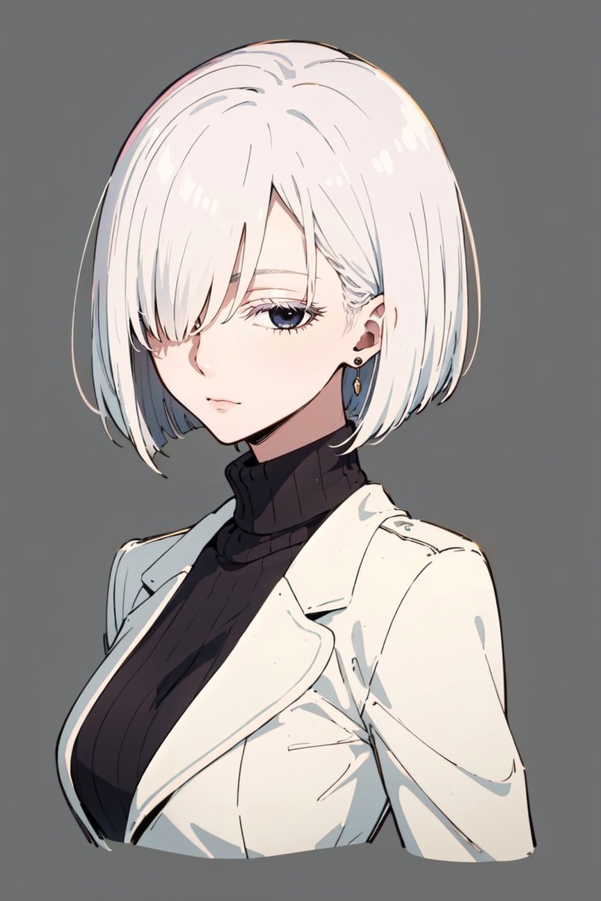 For her original outfit use the tags: pikkyfiona, 1girl, solo, looking at viewer, white hair, short hair, hair over one eye, bob cut, black eyes, breasts, large breasts, jewelry, earrings, gloves, coat, bag, blue coat, expressionless