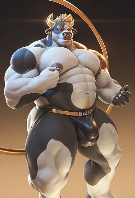 Duke_Smith, Furry, Bovine, Bull, Gold Horns, Gold Earrings, Gold Nose Piercing, Gold Nipple Piercings, Gold Cock Ring, Black Scelera, Glowing Gold Iris, Gold Fingernails, Thick Penis, Gold Hair, Large Pectorals, Muscular Male, Bara, Black and White Body