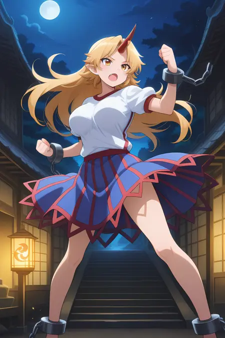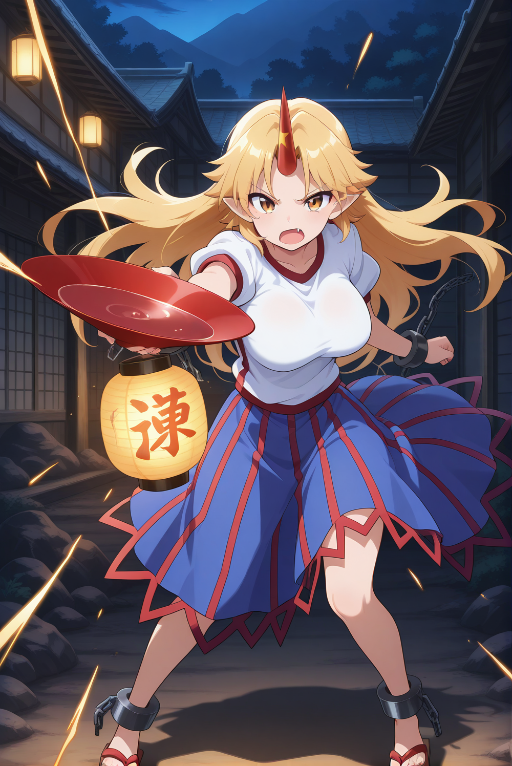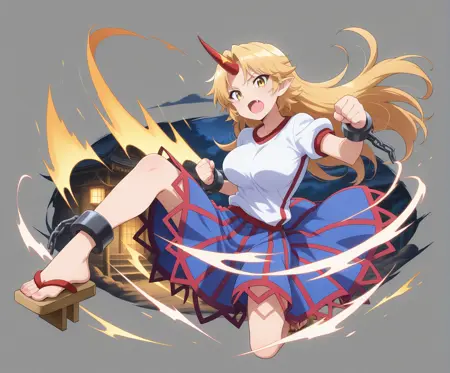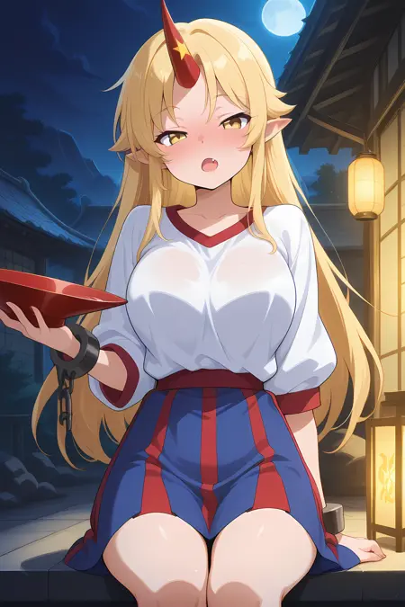 hoshiguma yuugi, 1girl, solo, red eyes, blonde hair, hair flaps, red horns, single horn, fang, pointy ears,