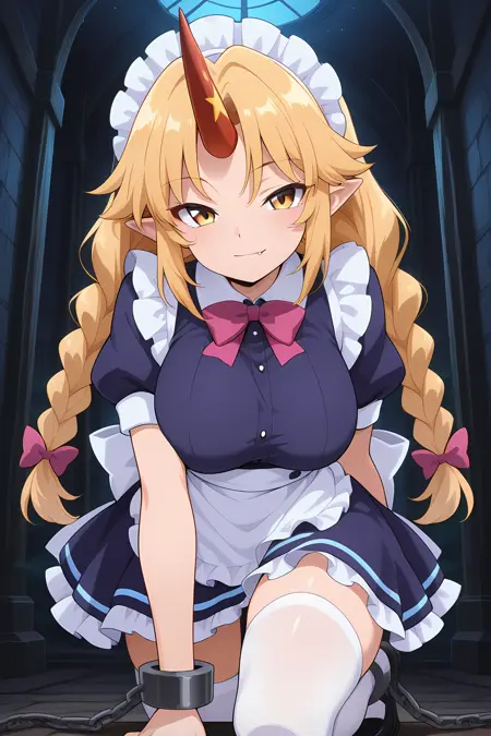 hoshiguma yuugi, 1girl, solo, red eyes, blonde hair, hair flaps, twin braids, red horns, single horn, fang, pointy ears,, alternate costume, maid headdress, hair bow, green bow, maid, white apron, red neck ribbon, blue dress, puffy short sleeves, frilled skirt, white thighhighs, blue shoes, mary janes, shackles, chain, holding weapon, gold gun, vacuum cleaner,