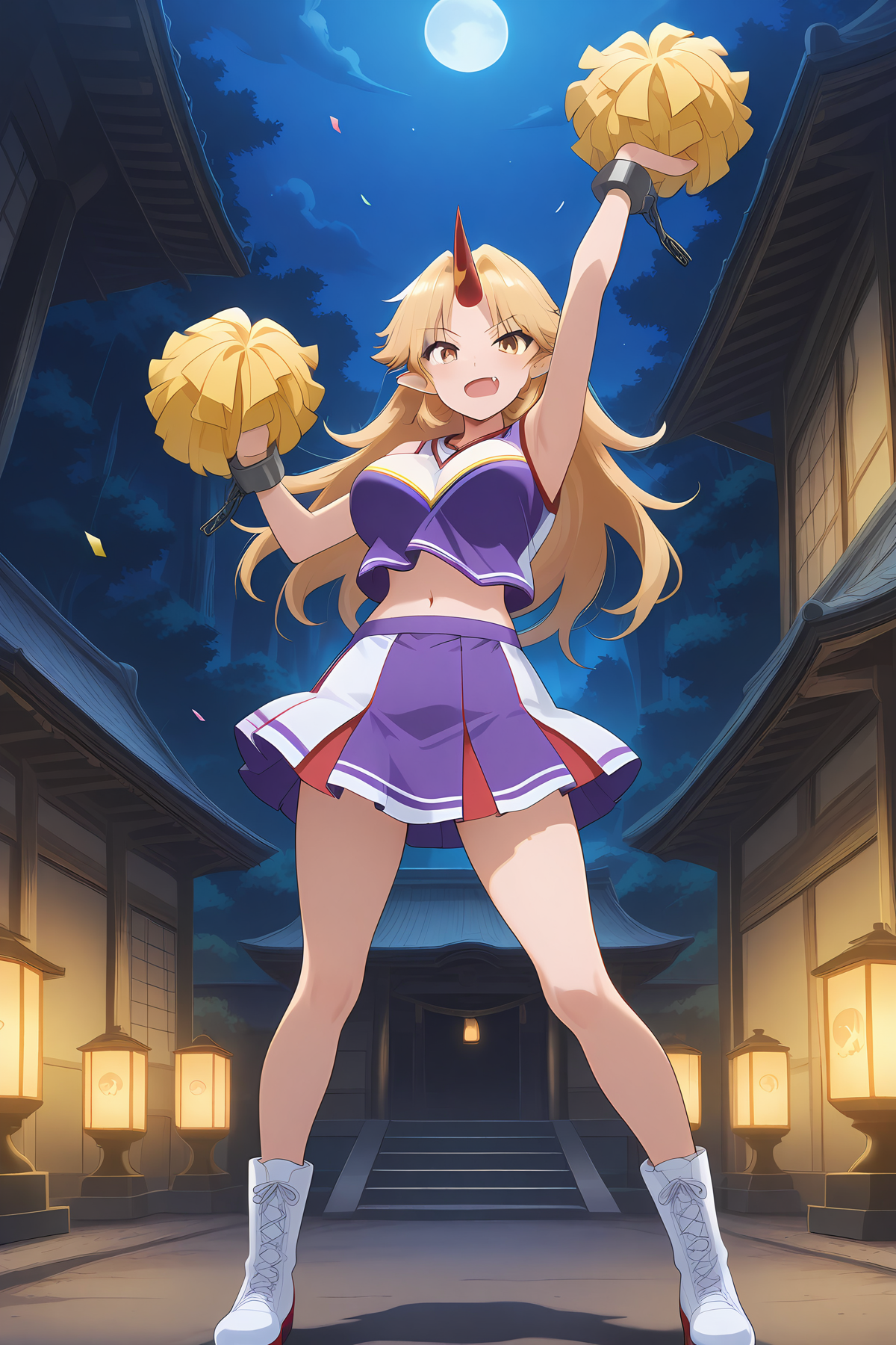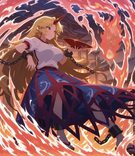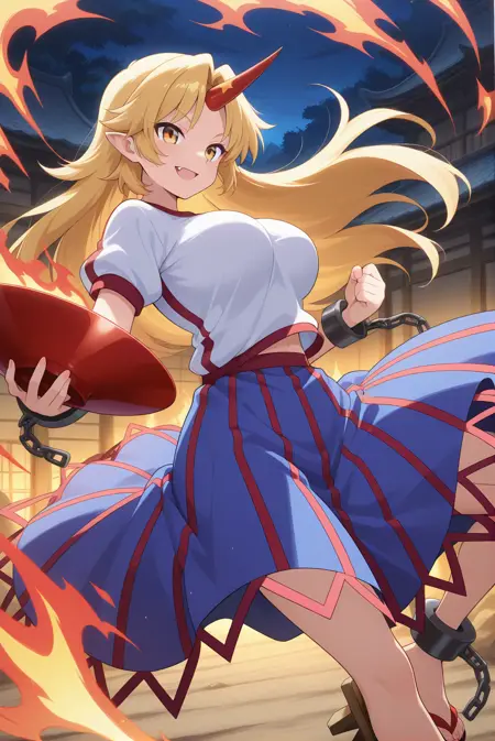 hoshiguma yuugi, 1girl, solo, red eyes, blonde hair, hair flaps, red horns, single horn, fang, pointy ears, hoshiguma yuugi \(former hell encouragement\), alternate costume, cheerleader, two-tone shirt, white shirt, purple shirt, navel, two-tone skirt, white skirt, purple skirt, lace-up boots, white boots, chain, shackles, holding, flaming skull, floating skull,