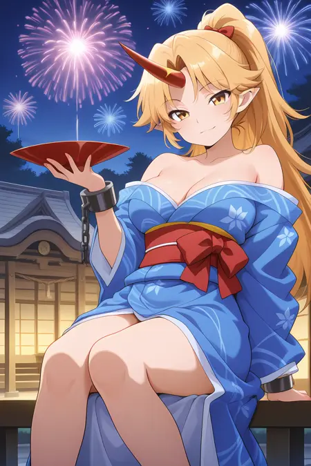 shackles, hoshiguma yuugi \(kabukimono of the former capital\), hoshiguma yuugi \(kimono\), kimono, blue kimono, collarbone, off shoulders, ponytail, sash, official alternate costume, arm support,
