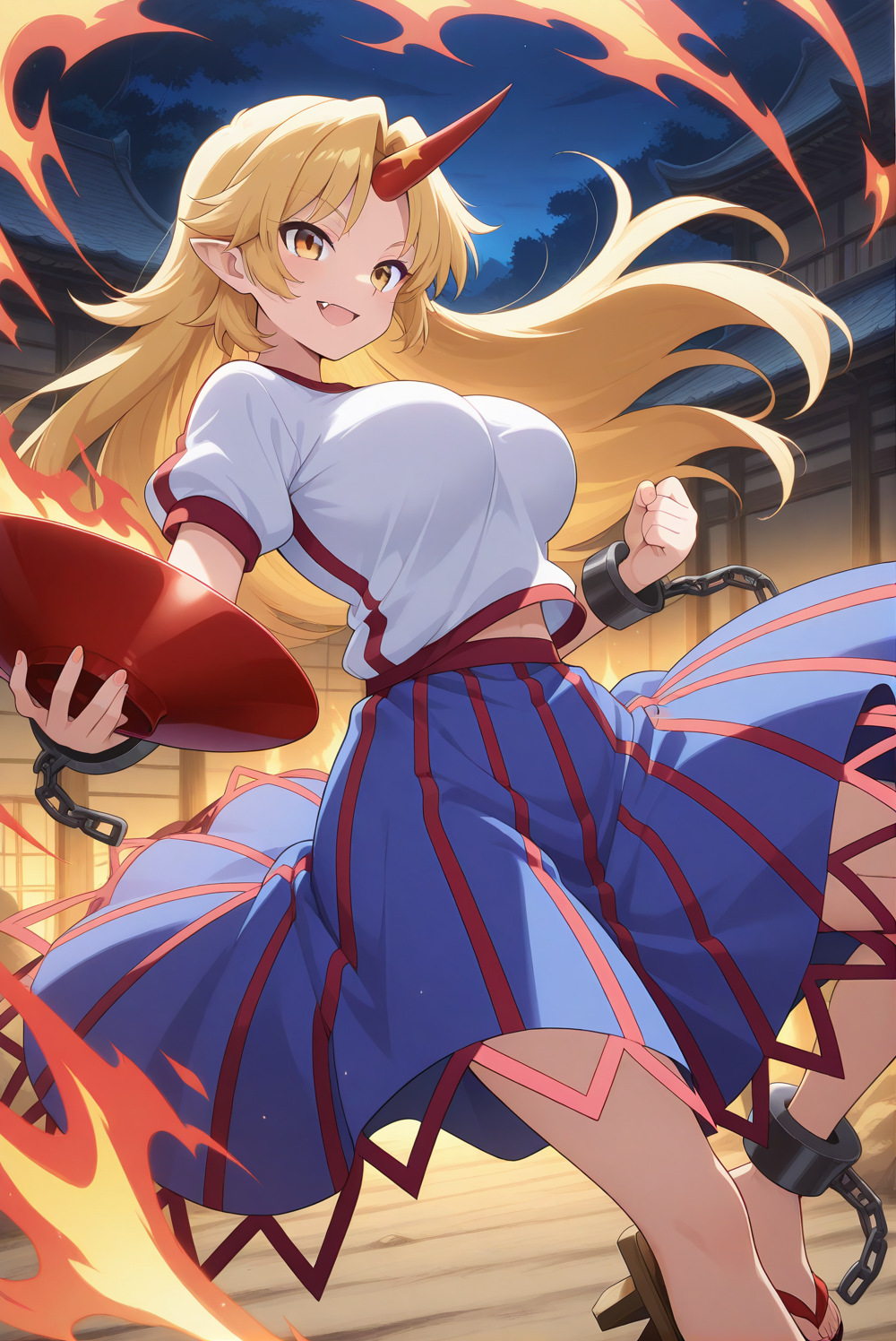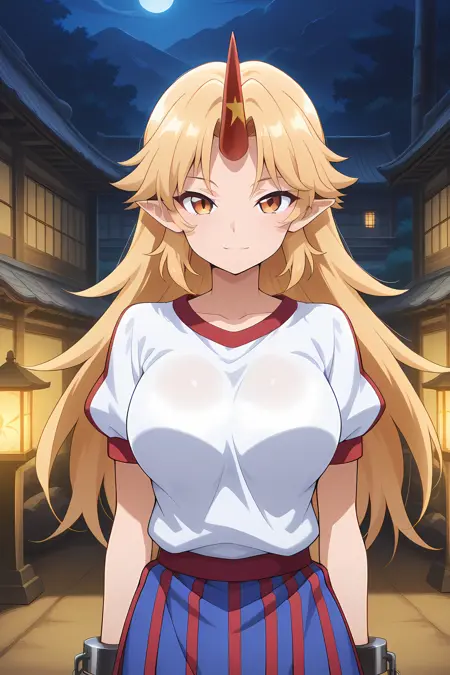 hoshiguma yuugi, 1girl, solo, blonde hair, yellow eyes, long hair, fang, single horn, pointy ears, oni horns, large breasts,