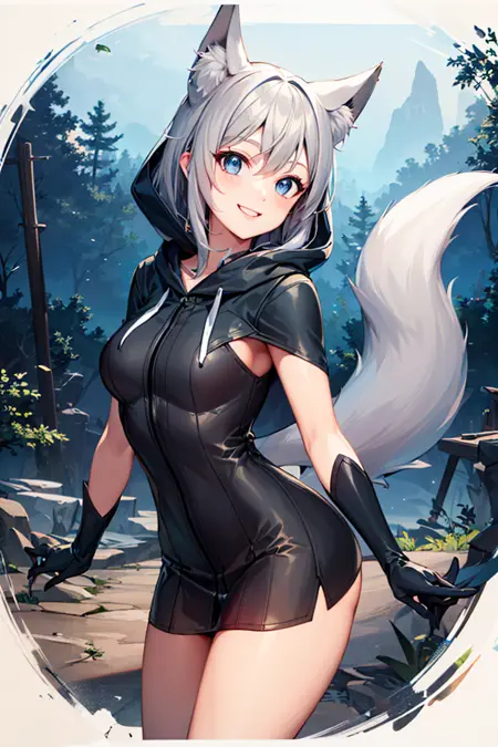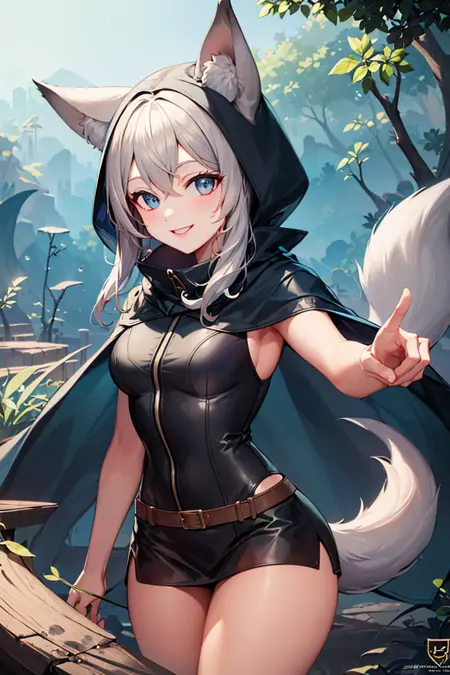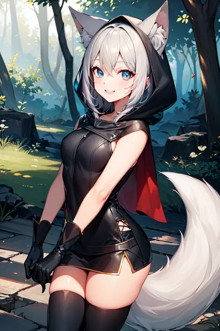 追加プロンプト: cape, fox tail, hood up, mini skirt,