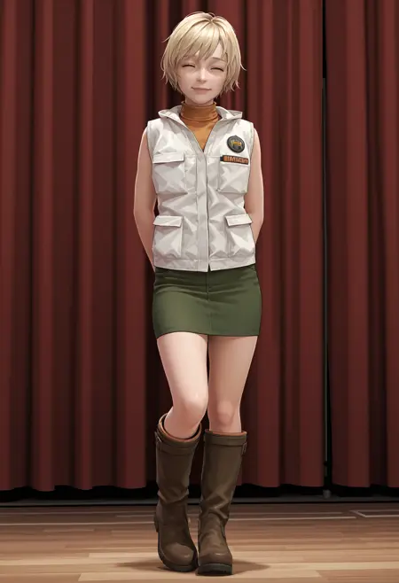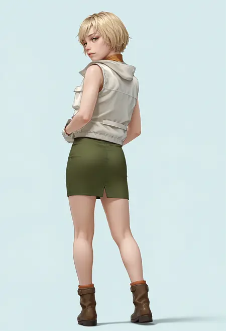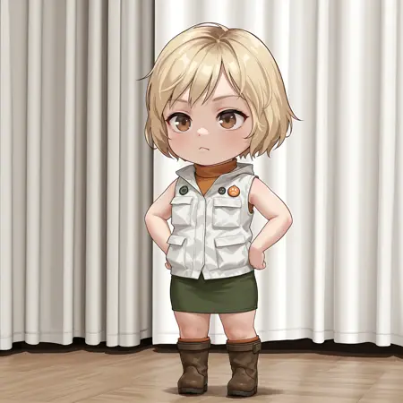 hmilf, 1girl, 갈색 눈, 금발, 단발, 소매 없음, 터틀넥, 조끼, 치마, 부츠, 팔찌