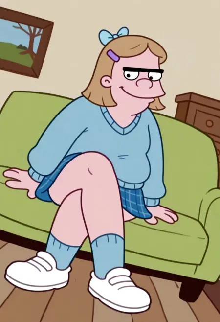 BigPatty, 1girl, light brown bobcut, unibrow, black eyes, purple hairclip, light blue bow