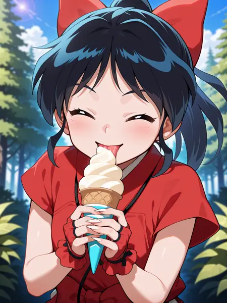 morohaIllustrious, 검은 머리, 리본, 갈색 눈, 긴 머리, 파닥머리, 머리 리본, 일본 옷, 짧은 소매, 빨간 리본, 빨간 반바지