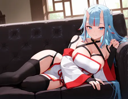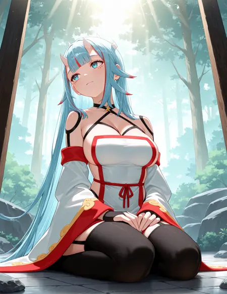 얇은 헬터넥, 측면 젖혀진 가슴, 흰 드레스, 자수, 골반 커튼, 넓은 소매, 손가락 없는 장갑, 게터 스트랩, 검은 허벅지 양말
