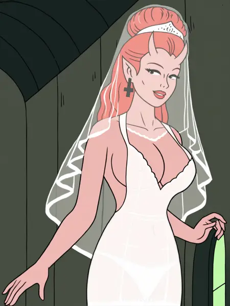 | 학습된 단어 | illith maggotbone, demon girl, horns, red hair, red lips, long eyelashes, pointy ears, colored skin, toon (style), flat color, upside-down crosses earrings, huge breasts, narrow waist, black eyes, long layered hair with side-swept bangs, 복사됨! veil, long veil, bridal veil, tiara, white dress, bride, bodycon dress,복사됨! black dress,short dress,복사됨! |
