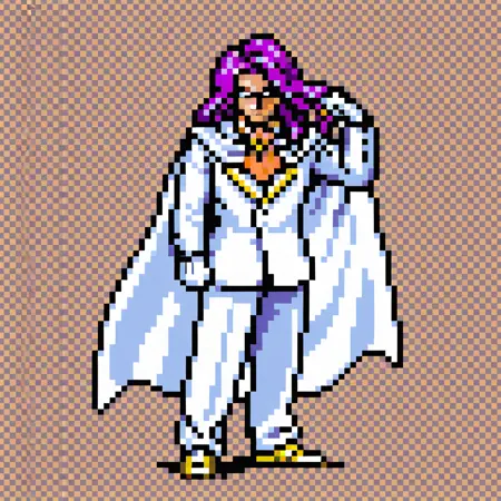 1boy, male focus, long hair, purple hair, light orange ascot, cape, formal, white suit, gold lapels, white dress gloves, white pants, gold brogue, white shoes
