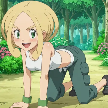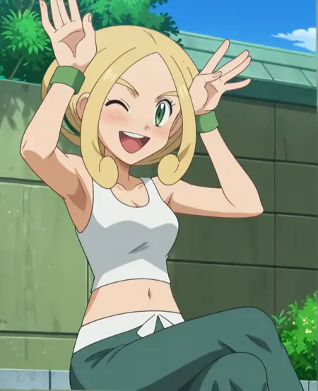 Trigger Words: violadef, 1girl, solo, blonde hair, green eyes, crop top, capri pants,wristband,