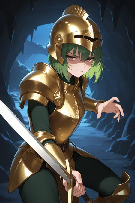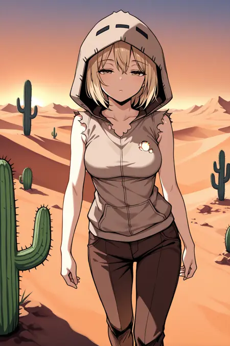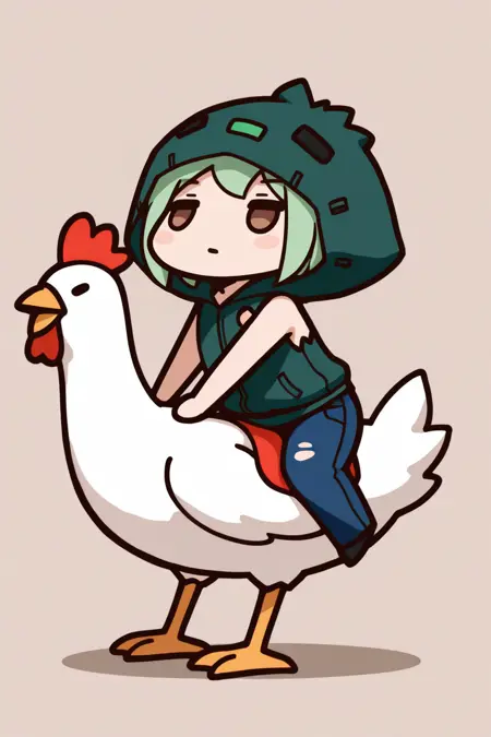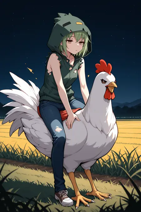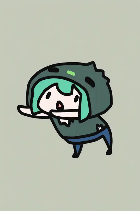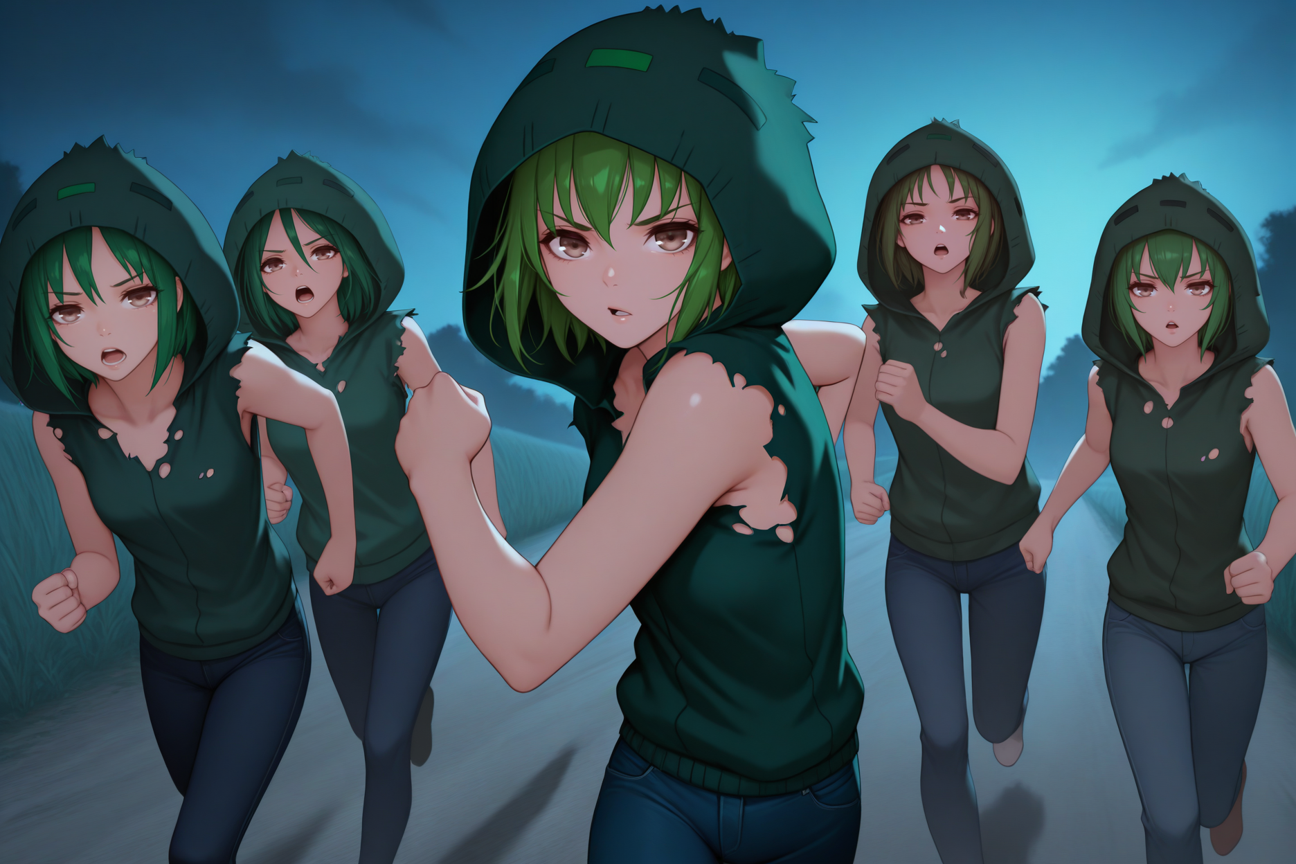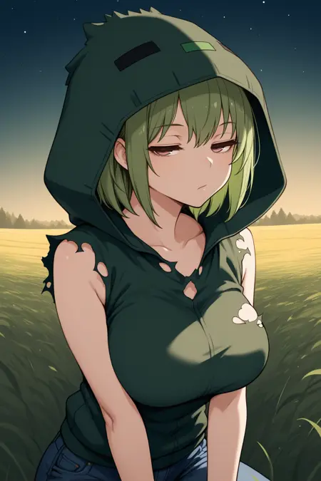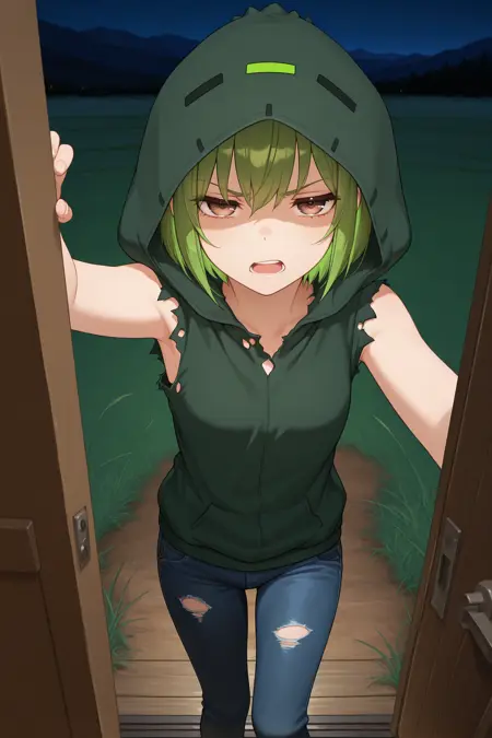 彼女の典型的な外見を表現するには、「グリーンのフード付きパーカー、ノースリーブ、ボロボロの服、フードをかぶった状態、ジーンズ」を追加してください。