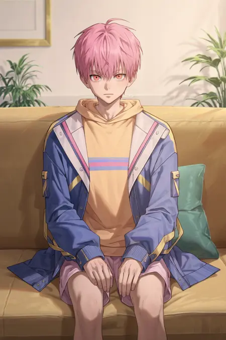 -blue jacket, yellow hoodie, hood down, pink shorts, white socks, purple shoes
