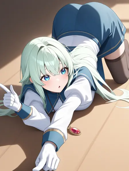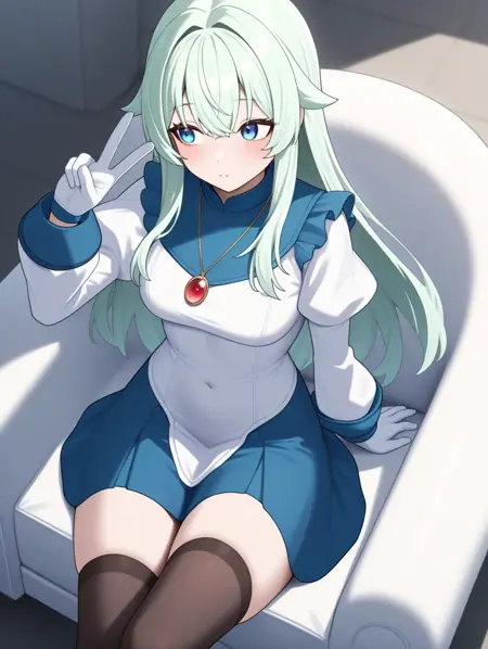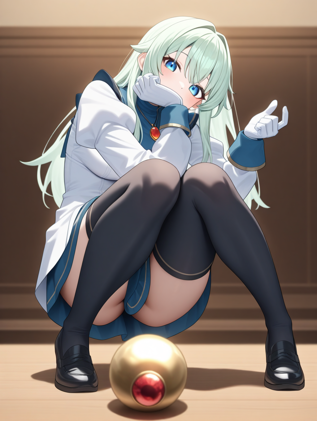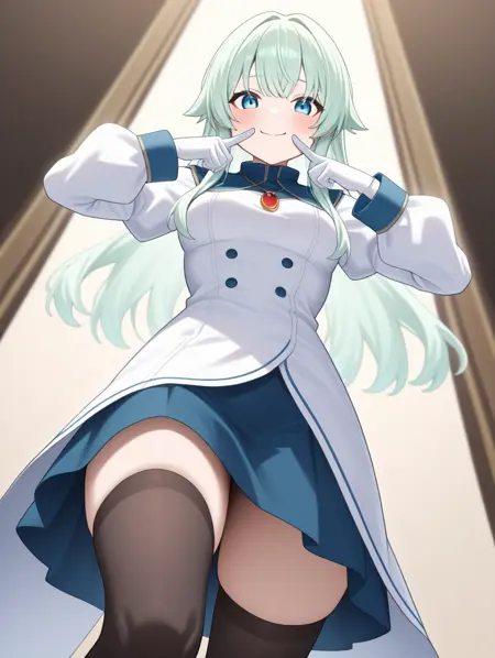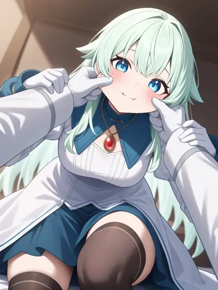 プロンプト例: rivaru,ライトグリーンの髪,ロングヘア,青い目,白いドレス,ふわふわの袖,ロングスリーブ,白い手袋,シンクレア,赤いペンダント,青いスカート,